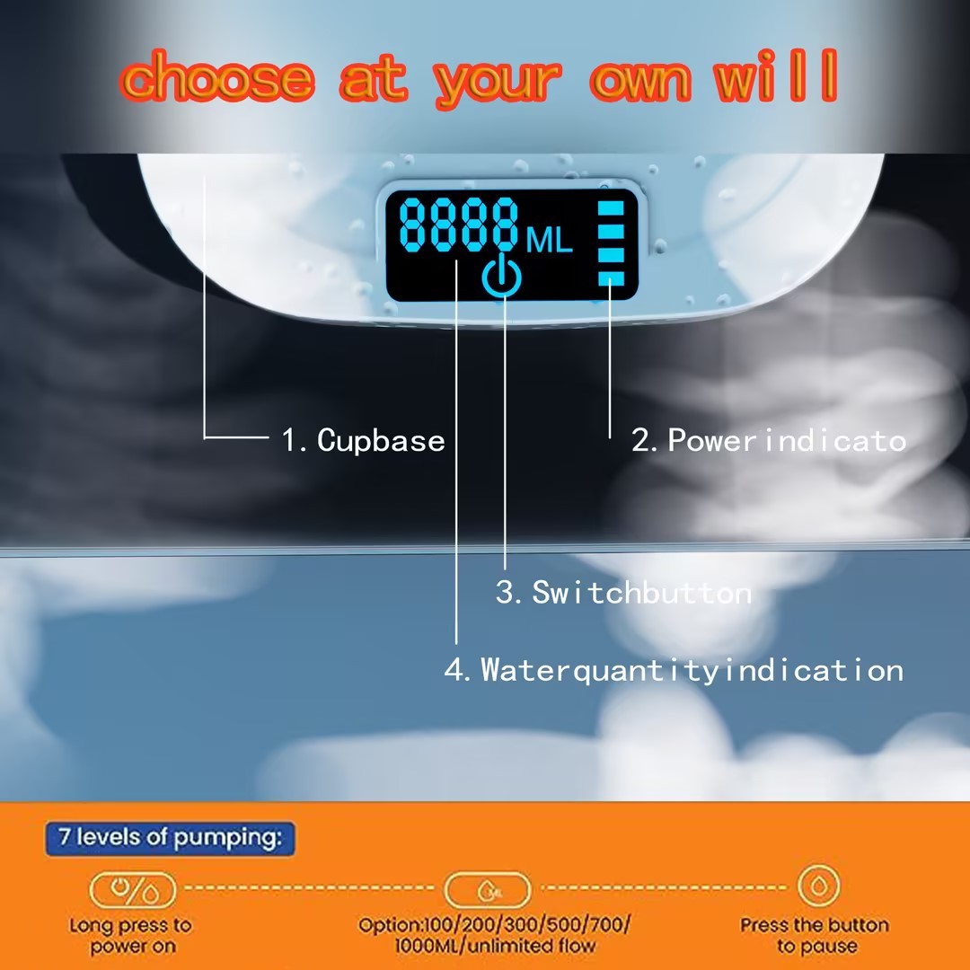 The Smart Portable Water Dispenser is equipped with advanced technology that offers 8 levels of quantitative pumping. You can choose from 8 different capacities with an indicator light for each (100ml, 200ml, 300ml, 500ml, 700ml, 1000ml, and an unlimited flow option). This makes it suitable for a variety of bottle sizes, ranging from 1 to 5 gallons. Whether you're filling a small glass or a large jug, this dispenser has got you covered.